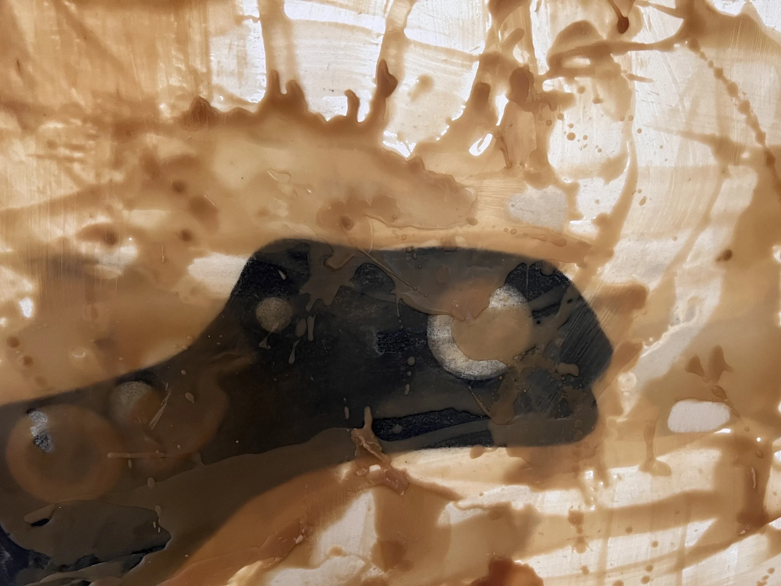 bivoks/kull på papir/kartong, olje på metall, fotoprinter malt med akrylfarge/bivoks/oljepastell, vinylfarge/olje på kartong, mur malt med akryl- og vinylmaling, stoff